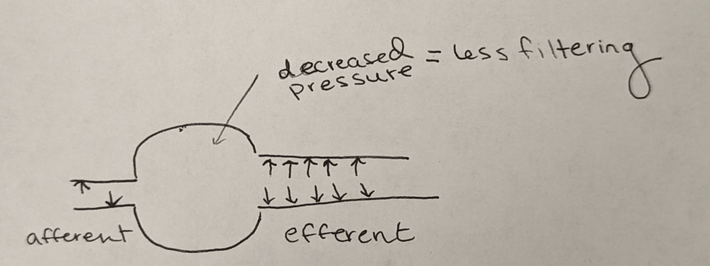 Because that hydrostatic pressure is decreased, you will end up with less filtering (less filtrate aka future urine) within that bowman’s capsule.
