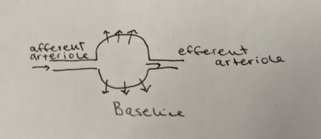 To orient you, we have the afferent arteriole on the left bring blood into the glomerulus/bowman’s capsule (that circle/ball thing), where urine will be filtered out of the blood via hydrostatic pressure (hence the lil arrows filtering out).